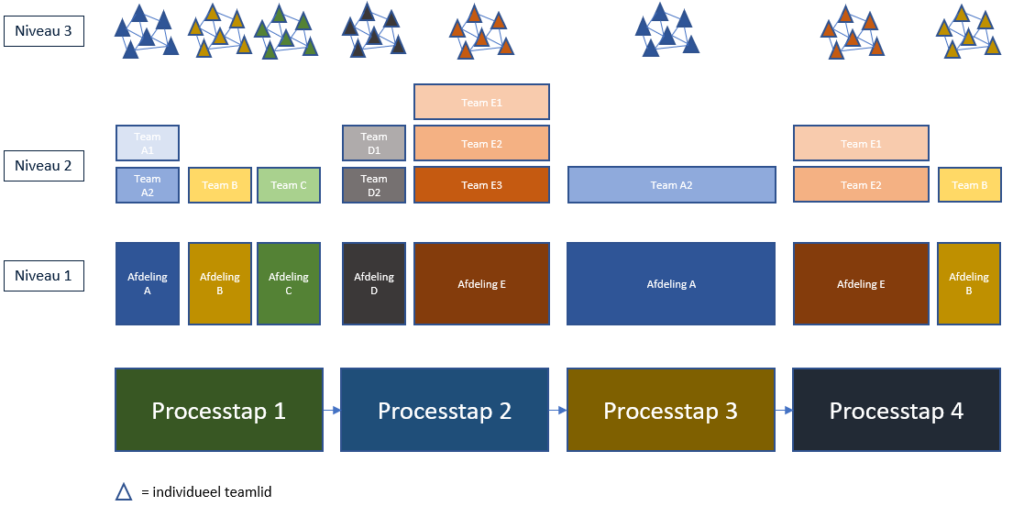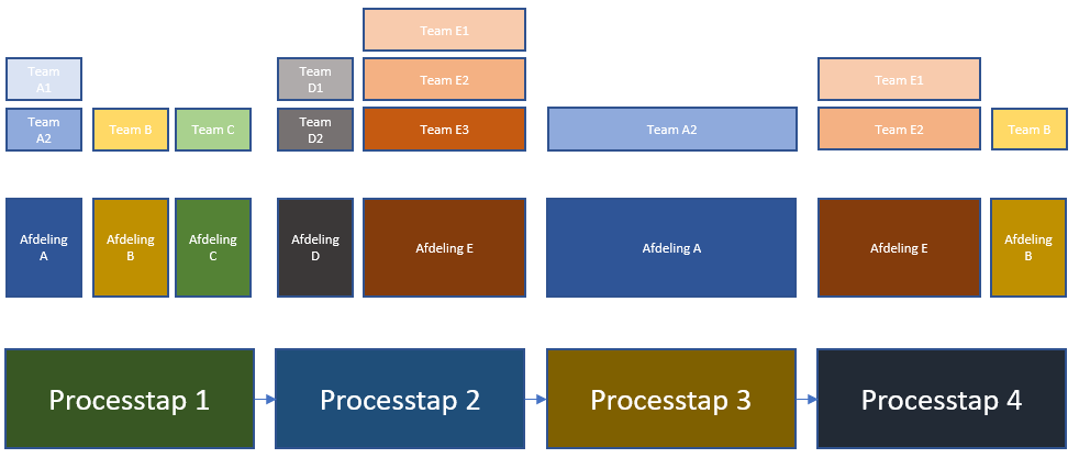 In de praktijk is het echter niet zo eenvoudig als 1 afdeling per processtap en  zijn er veelal meerdere teams werkzaam binnen 1 afdeling. We hebben dit gevisualiseerd in de volgende afbeelding:
